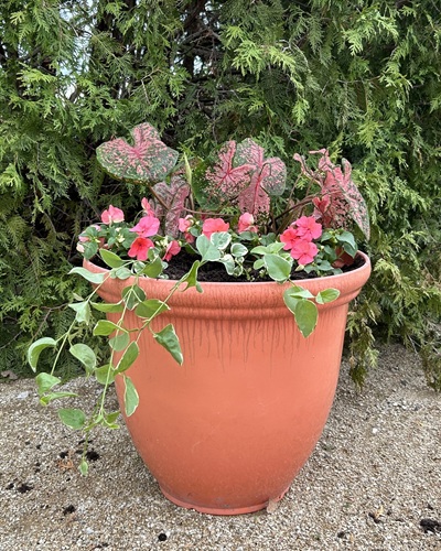 With our height element in the back, we placed our spiller in the front. A spiller can be any plant that will spread or cascade down the planter. Some of the most common are ivy, vinca vine, and sweet potato vine, but there are plenty more you can find in your local garden center!