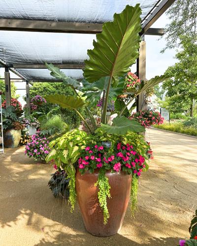 The sky is the limit! (Literally!) There’s no ignoring this jaw-dropping combo. The impatiens add a vibrant pop of color while this hybrid elephant ear plant gives a dramatic height element.